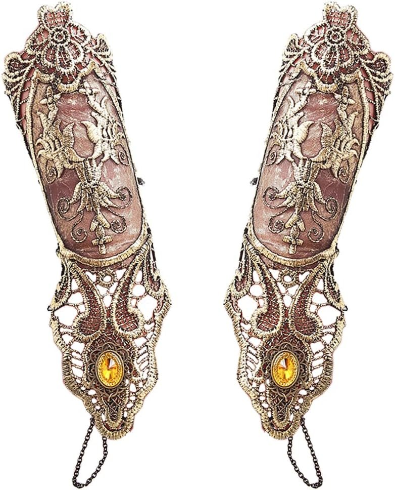 Bronzing Fingerless Gloves Women Gothic Floral Lace Steampunk Wristband Ring Vintage Beaded Handmade Up Bridal Bracelet Set – 1 Pair Small Size