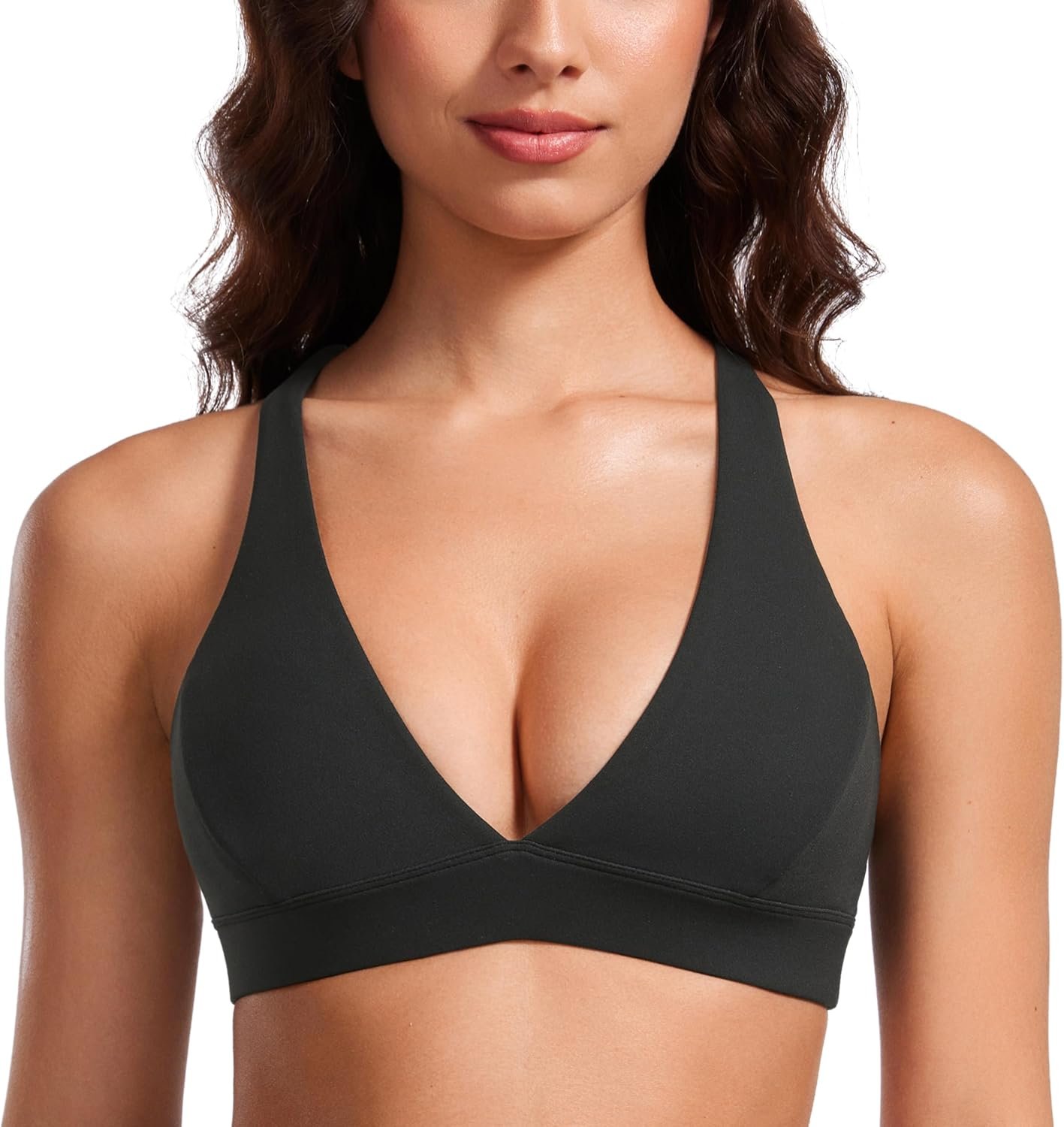 CRZ YOGA Butterluxe Deep V-Neck Sports Bras for Women – Spaghetti Strap Criss Cross Padded Top Low Coverage Wireless Yoga