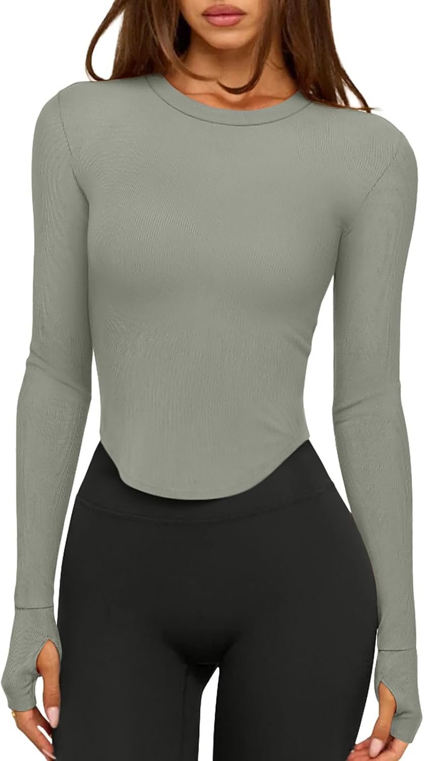 LASLULU Womens Long Sleeve Workout Tops Crop Tops Crew Neck Ribbed Slim Fitted Breathable Running Yoga Going Out T-Shirts